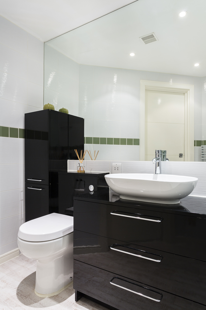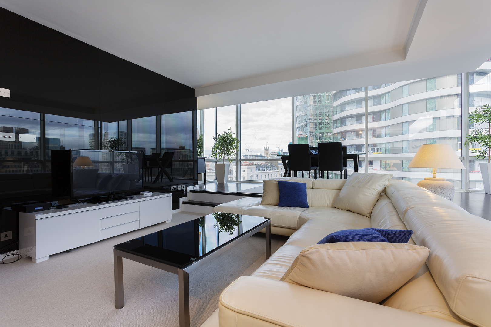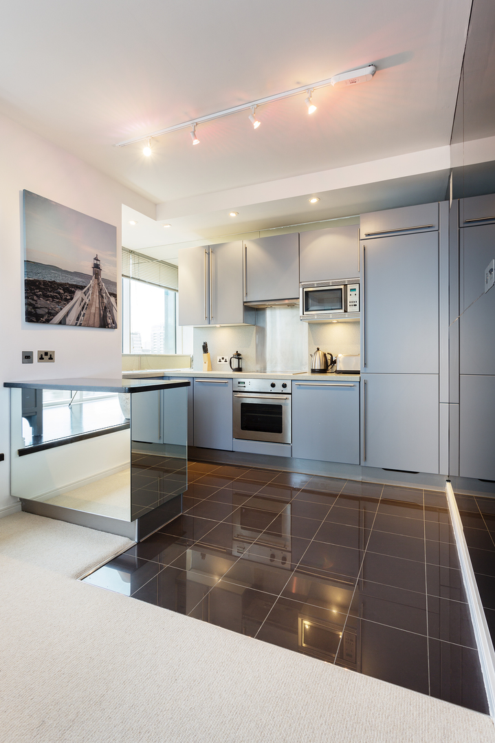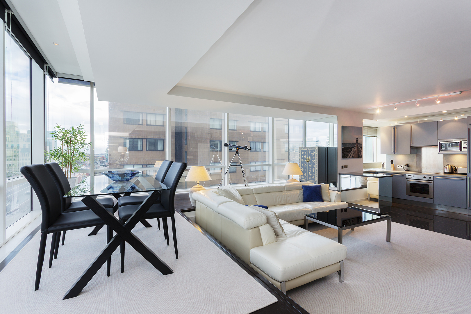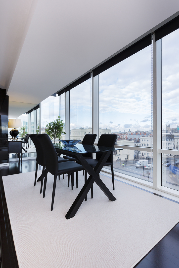 The crowning jewel of the apartment is the large living area and open-plan kitchen. Its all-glass walls offer a stunning panoramic view of the River Thames and some of the famous landmarks of Westminster. However the interior is just as stunning, with a very modern finish of sleek black mirrored walls and polished marble floors.