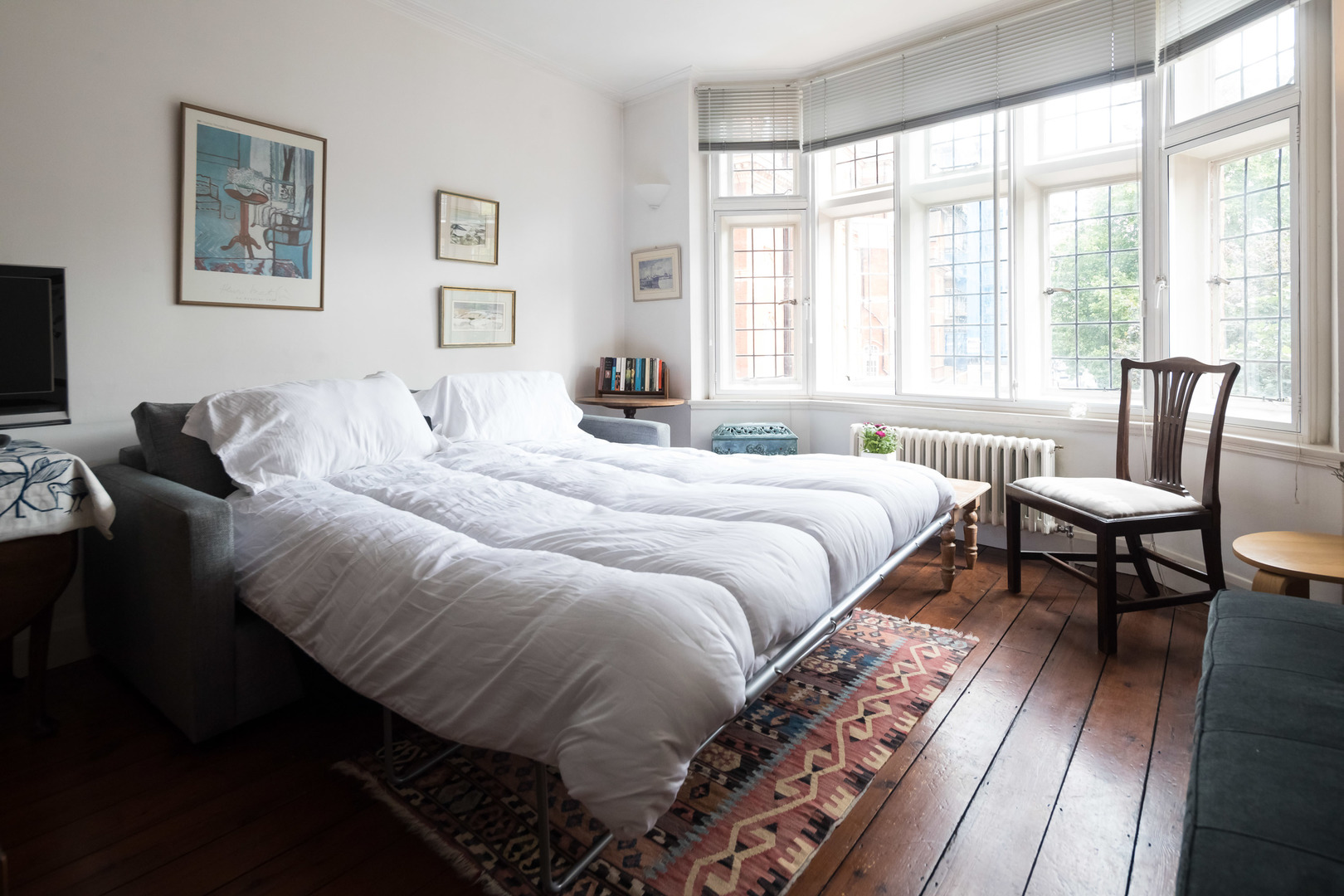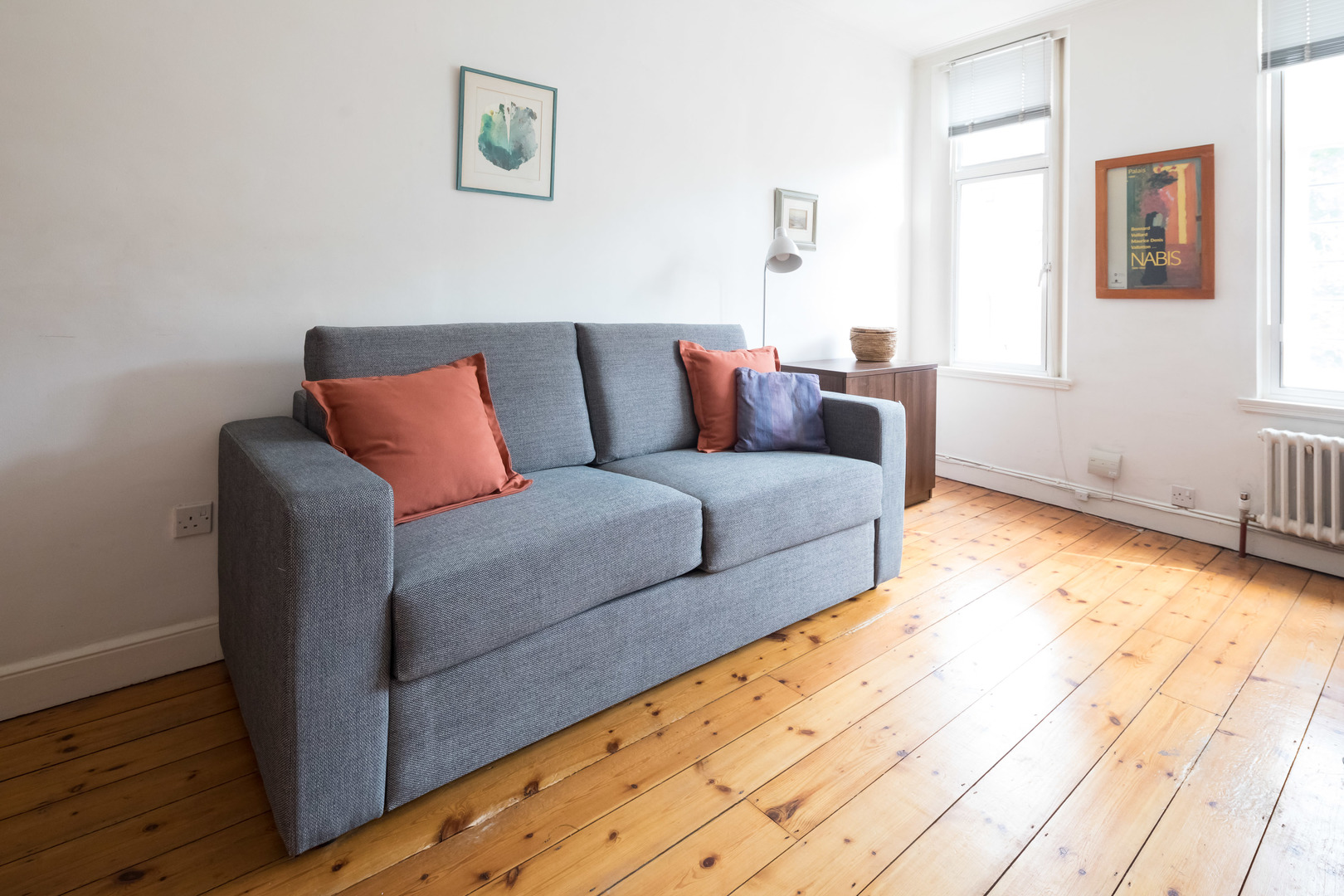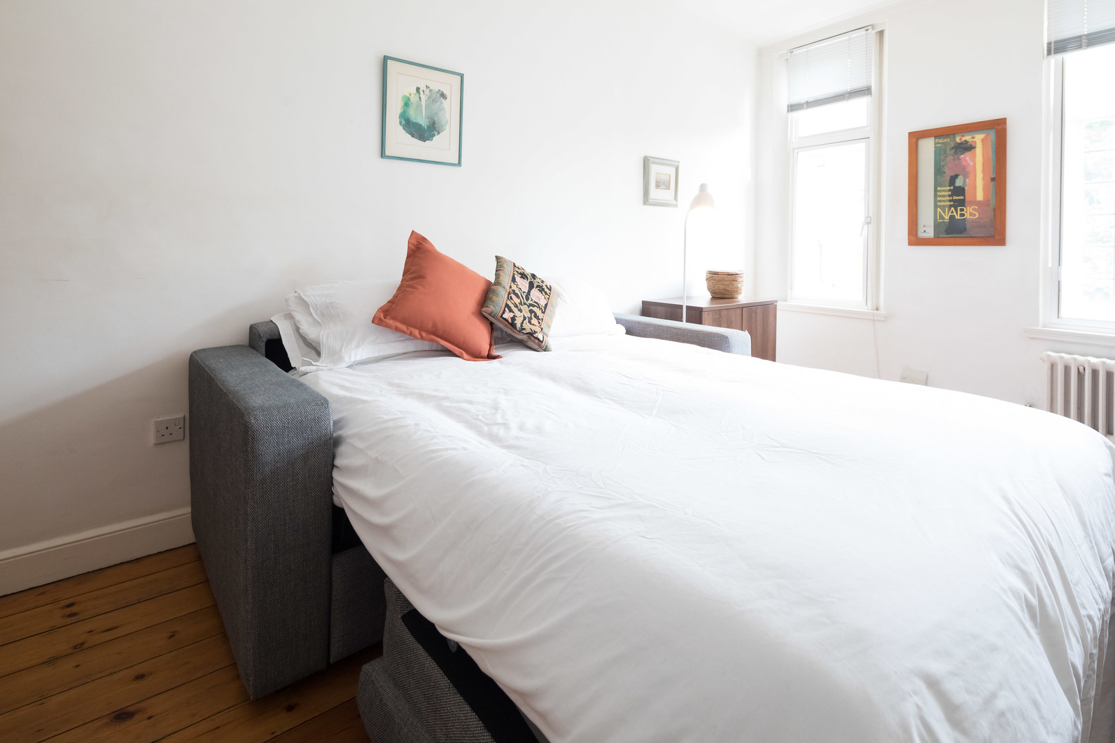 A dining-table for 6 is also located here between the kitchen and living-area – and there are also two stools at the breakfast bar. The space is nicely decorated with statement pieces of furniture and artwork. Both sofas can extend into double sofa beds enabling 3 adult guests or 2 adults and 2 children to sleep in the living-room.