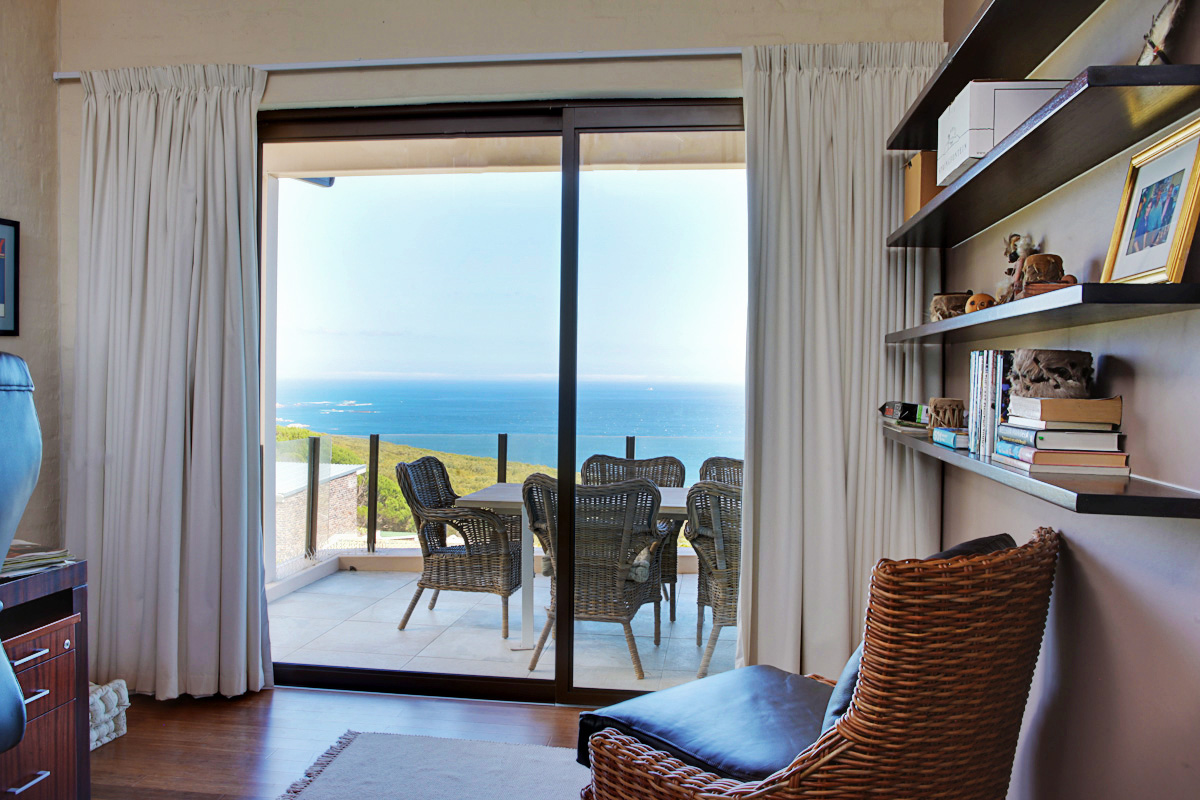 Large sliding doors connect these spaces with an outdoor terrace, which runs the length of the house and offer ocean views. A fully equipped kitchen offers all amenities, including a gas stove, built-in oven, and double fridge/freezer, with a washing machine and tumble dryer tucked away in a concealed cupboard. The lounge flows out onto a wide terrace, which enjoys an outdoor dining table for six, an elegant outdoor lounge area and barbeque.