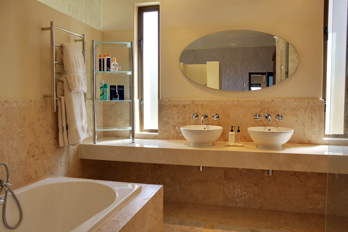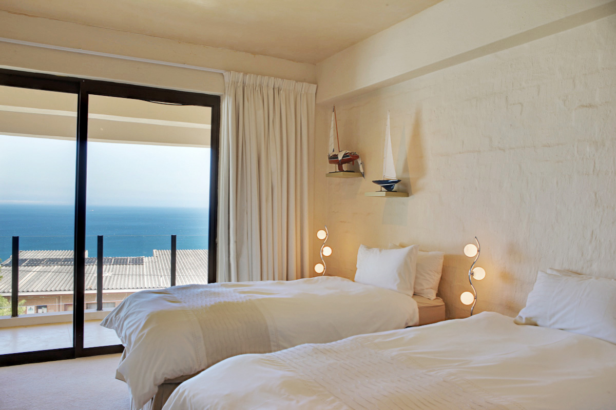 Sun loungers on the front terrace and in the back courtyard are perfect for long relaxing days in the sun. Three bedrooms offer comfortable and cosy havens on the lower level of the house, with ample cupboard space, and lovely sea views. The master bedroom has a king-sized bed and en-suite bathroom with shower and bath, while the second and third bedrooms have queen-sized and twin beds, respectively, and share a bathroom with a shower-over-bath.