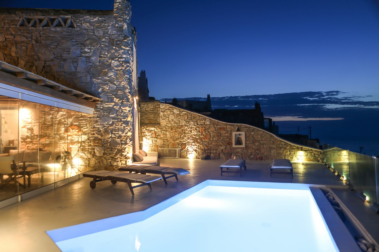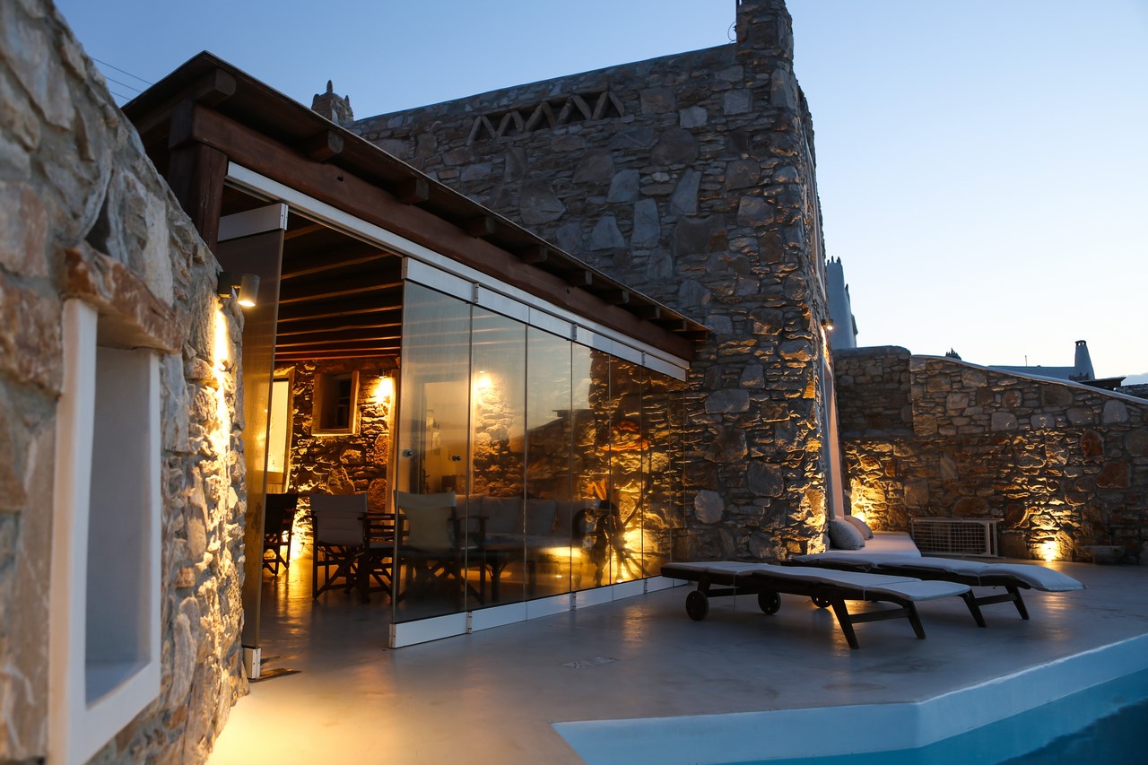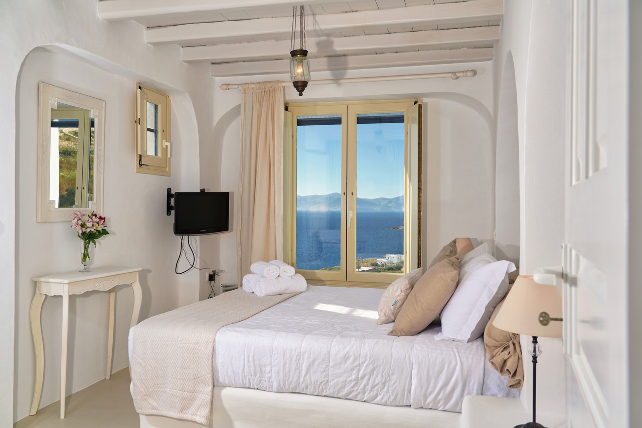 Villa Rea is located in the Cavo Delos area of Mykonos and boasts a stunning view of the Aegean Sea. Sitting on the outdoor deck, guests can enjoy a beautiful sunset as they lounge by the private swimming pool. The villa is built in traditional Mykonian style and exudes the unspoiled charm of the island.