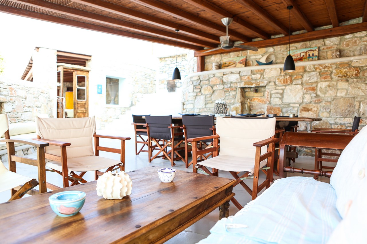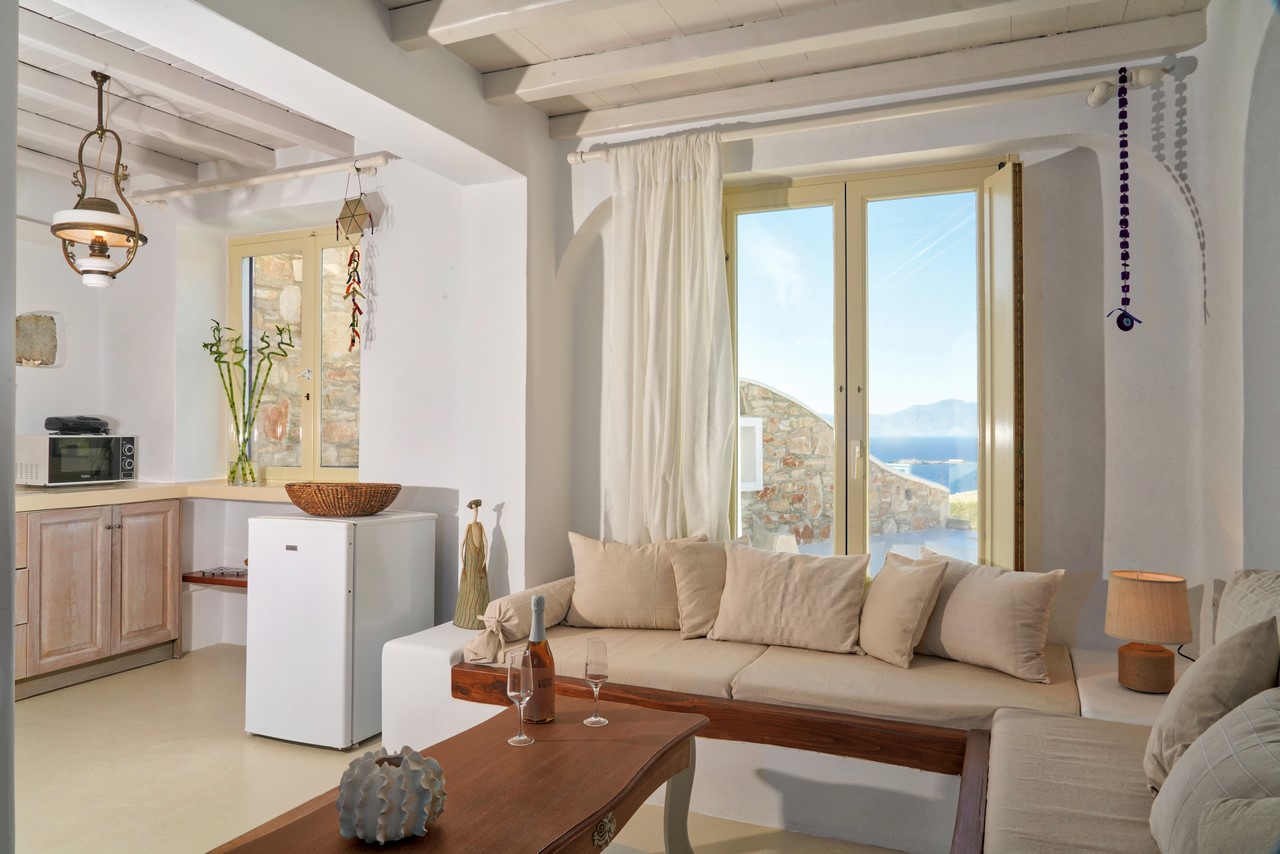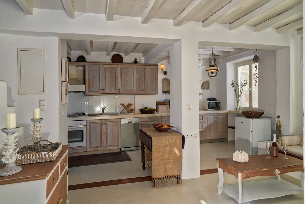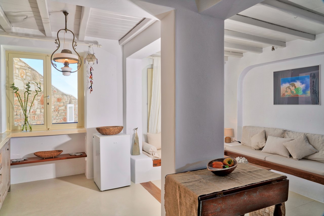 With its antique furniture, gorgeous location and convenient distance from Mykonos Town Villa, Rea has a lot to offer its guests. Villa Rea is a two-level house that has two independent guesthouses. Together, the houses can accommodate a total of six guests or three couples Villa layout Main House Ground Floor: - Open plan living room and kitchen.