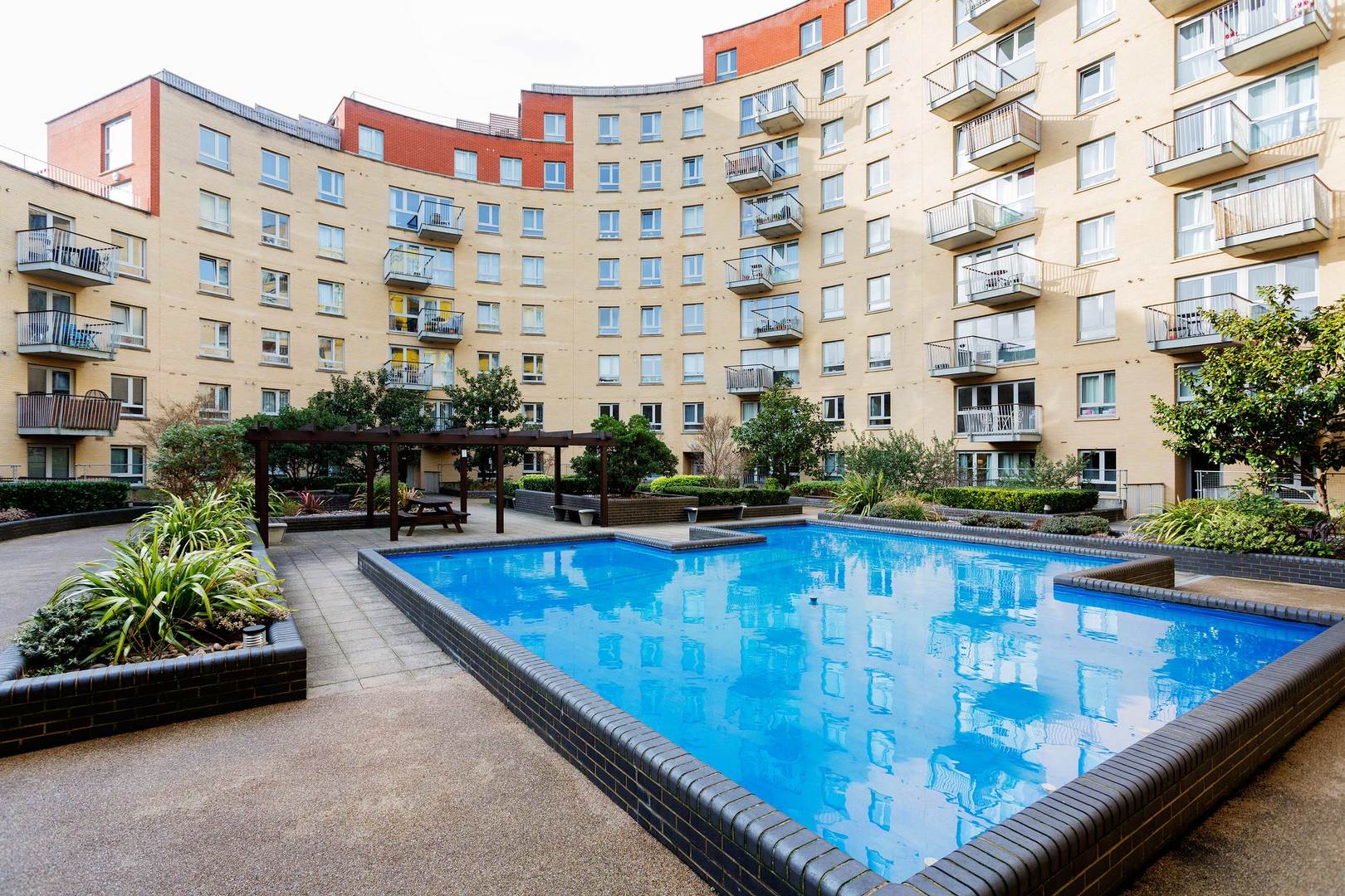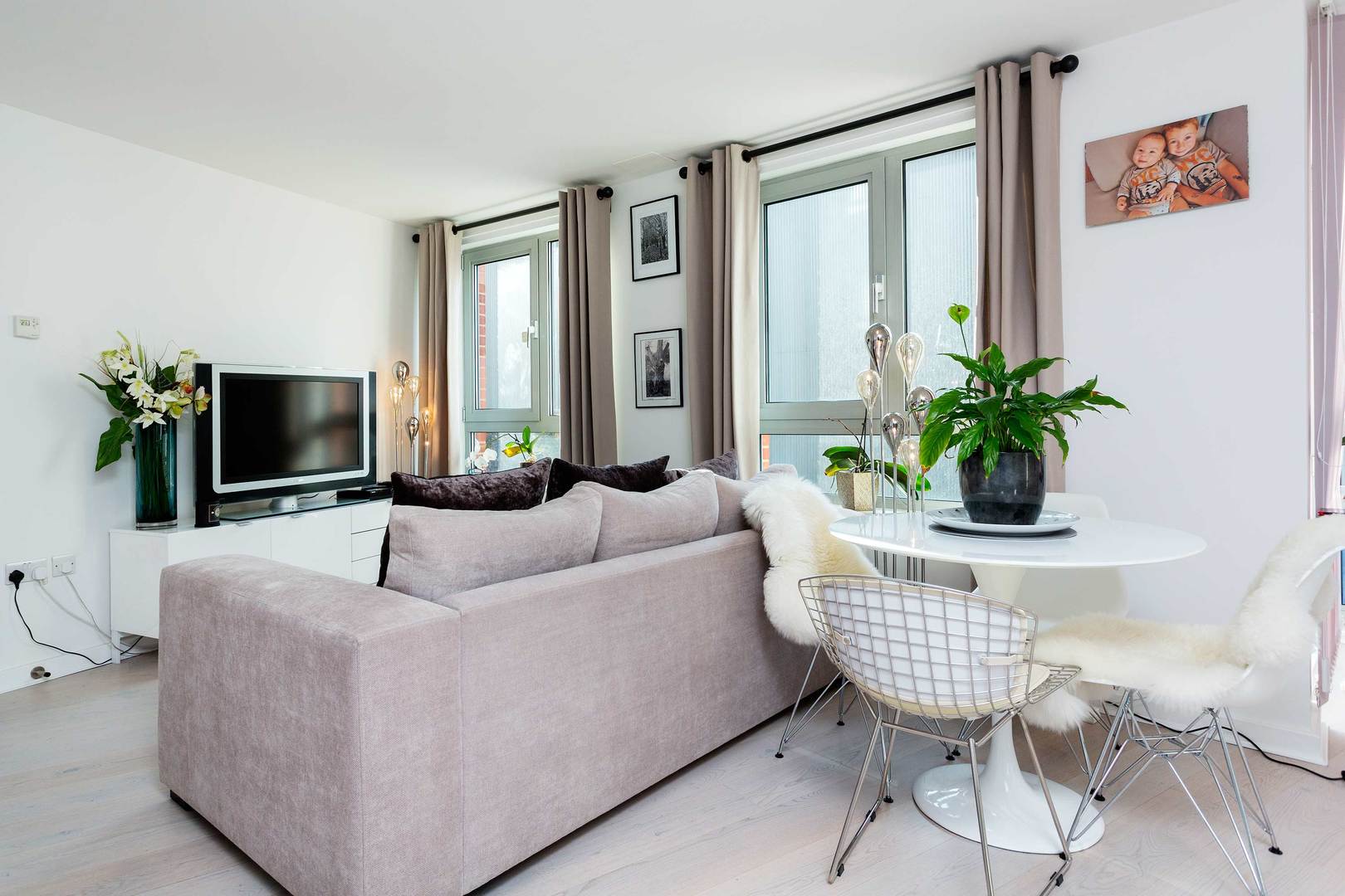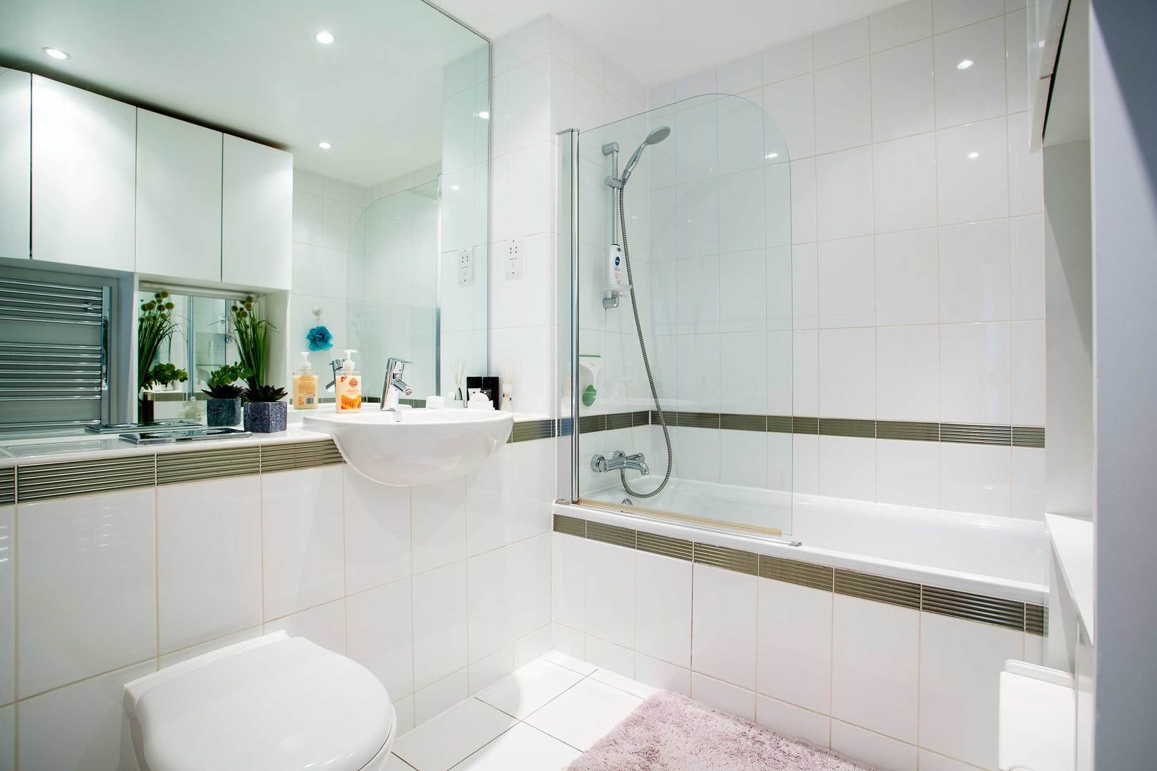 BATHROOM The bathroom is sleek and includes a bath with overhead shower, basin and WC. Within the complex, there is a communal gym and gardens. House Rules: No smoking, pets or parties! The lead guest must be at least 25 years old| Veeve reserves the right to refuse a booking if it thinks the property will be used for a party Home truths: No smoking, pets or parties!