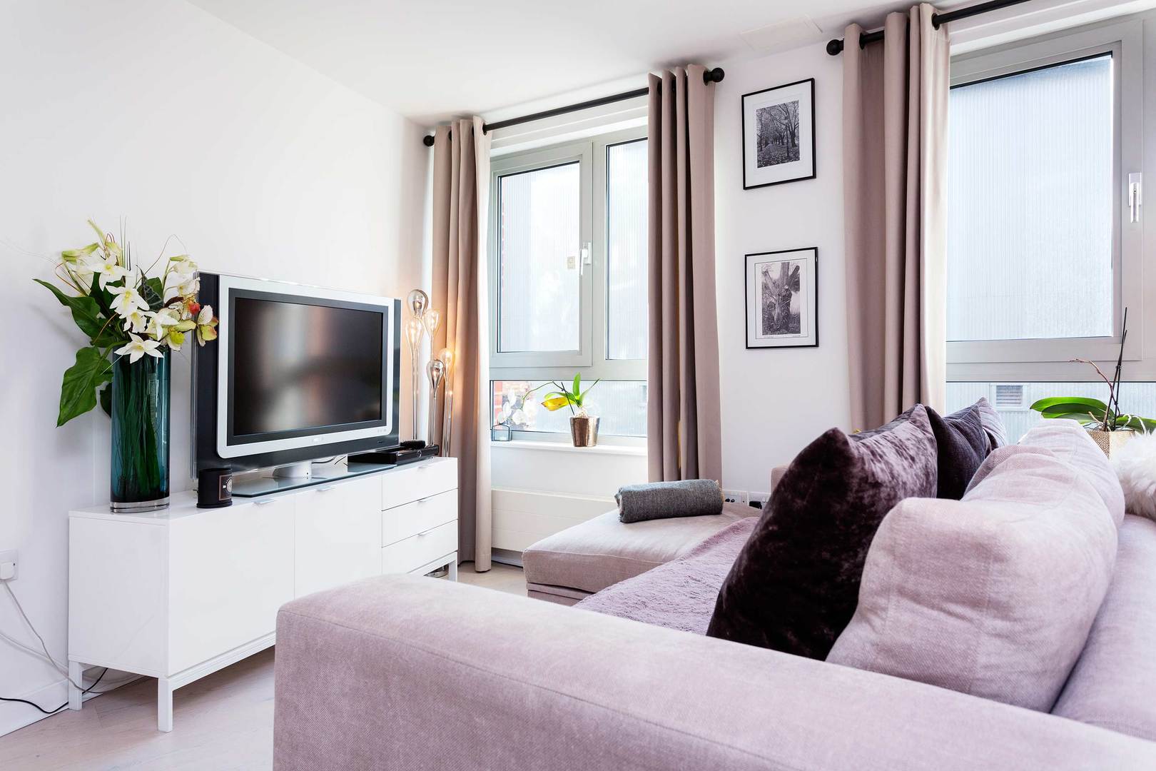 The living area includes a corner sofa, opposite the television, with surrounding artworks on the walls.