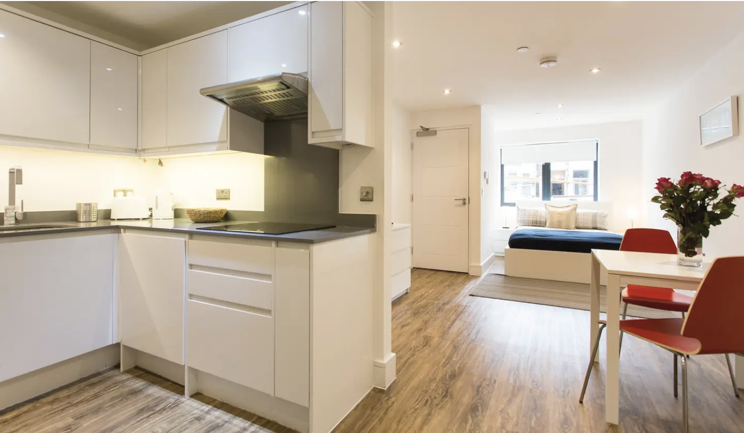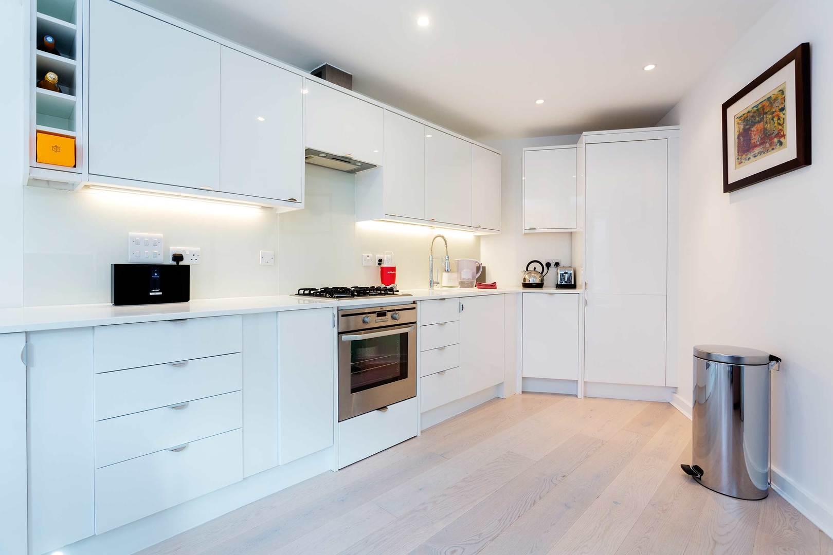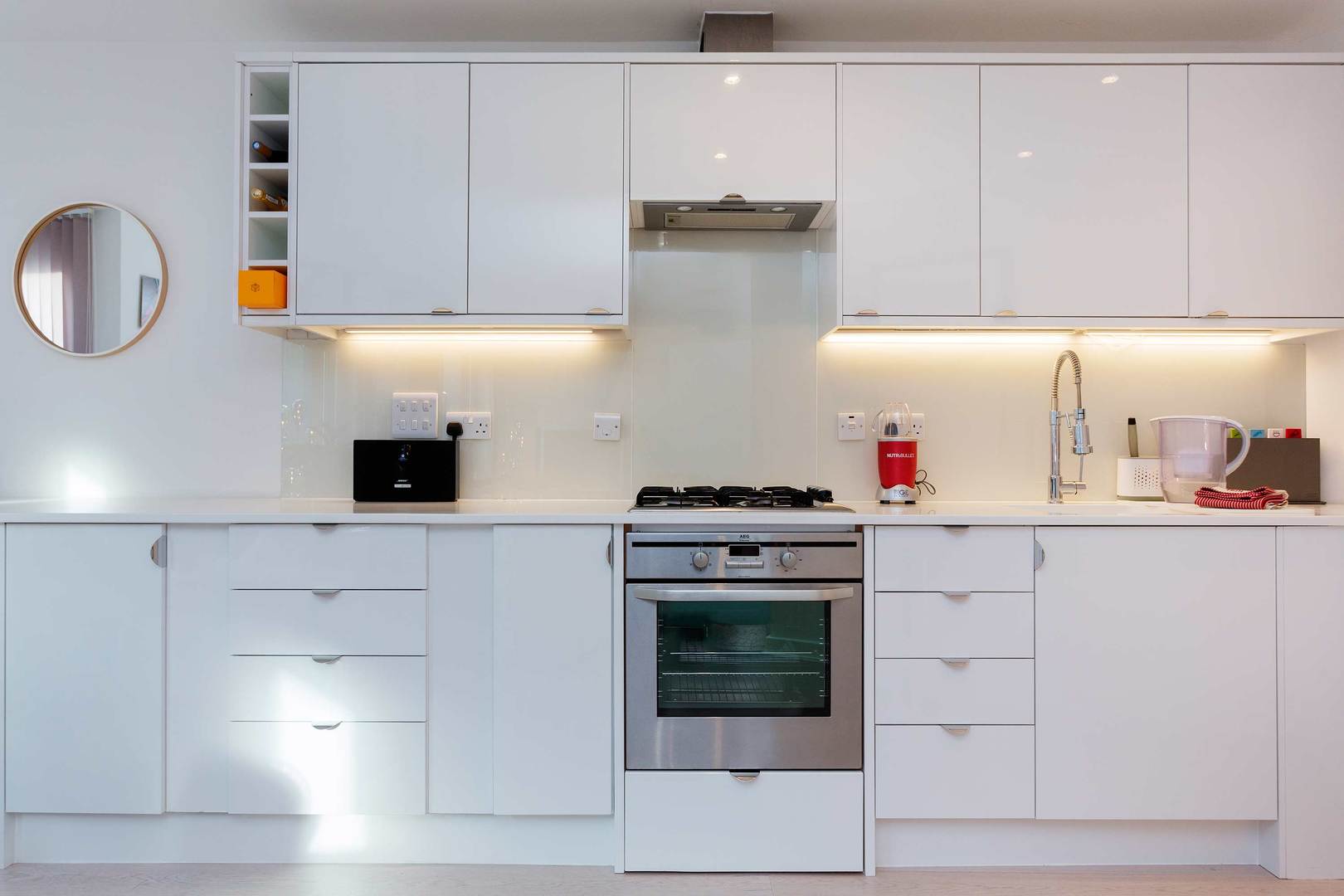 The kitchen is contemporary, in bright white. It includes all the amenities you will need during your stay. There is a circular dining table and chairs in this space as well.