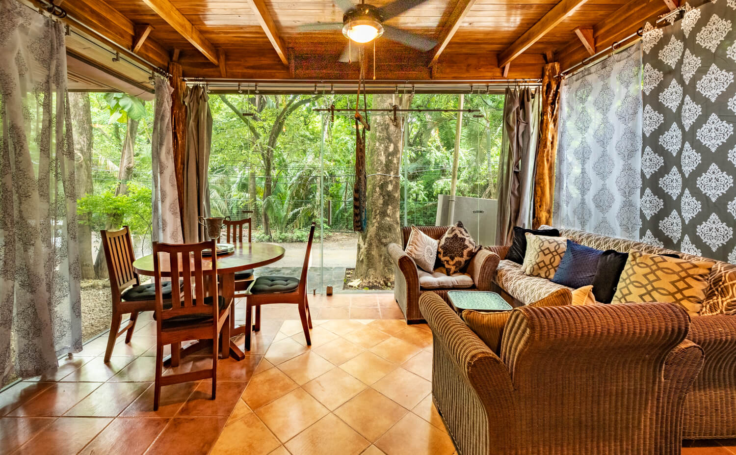 It includes AC, ceiling fan, Smart TV with Cable + Netflix. Kitchen: The quaint kitchen area is fully equipped with essentials needed for a family dinner. There is an AC unit and ceiling fan| Living Area: The living area is located in the front of the unit, from here you can see and watch wildlife in the trees and passing by. The glass doors open to provide the casita with more of an outdoor feel. The living area is perfect to relax and read a book or drink your moring cup of coffee.