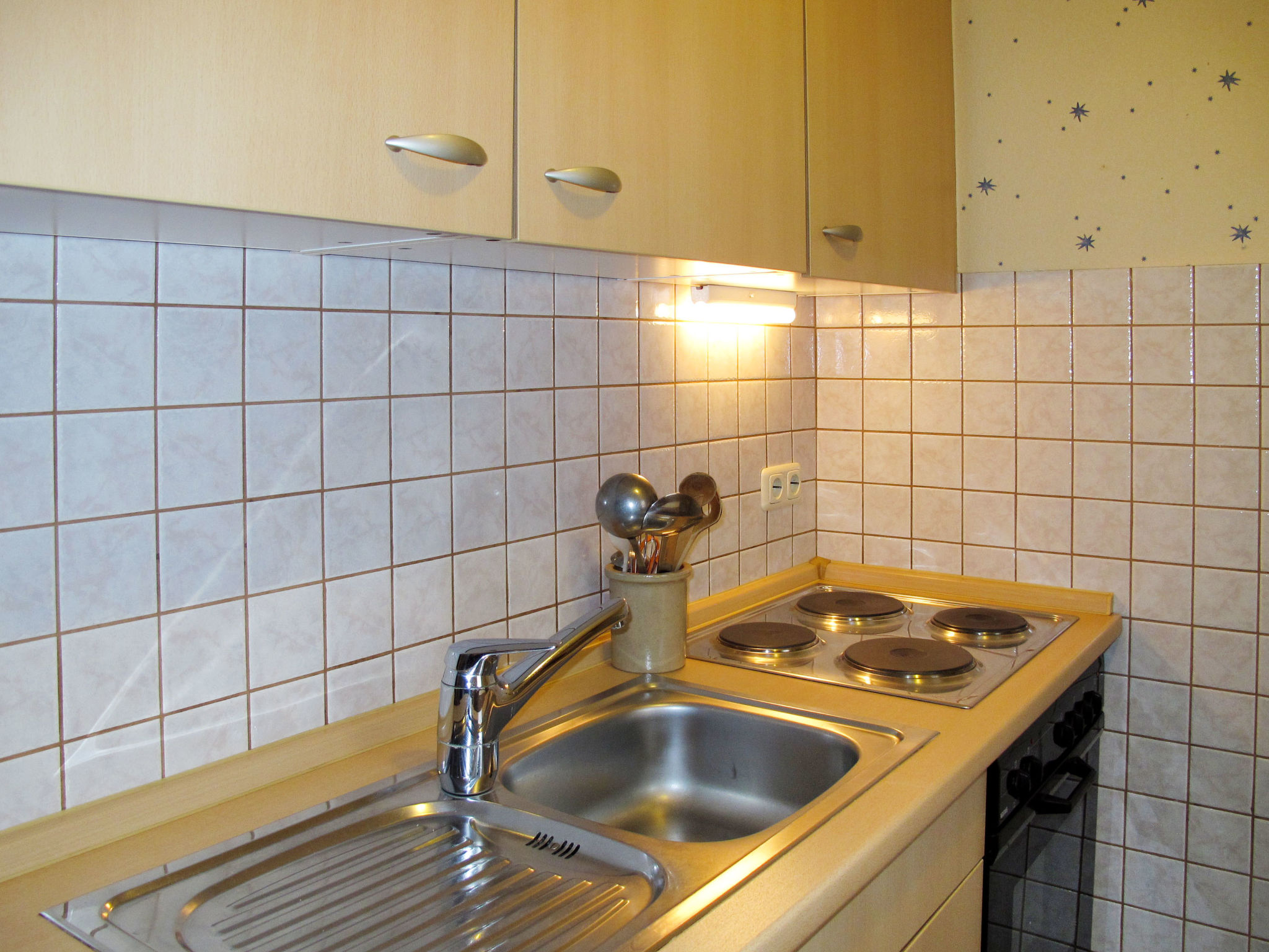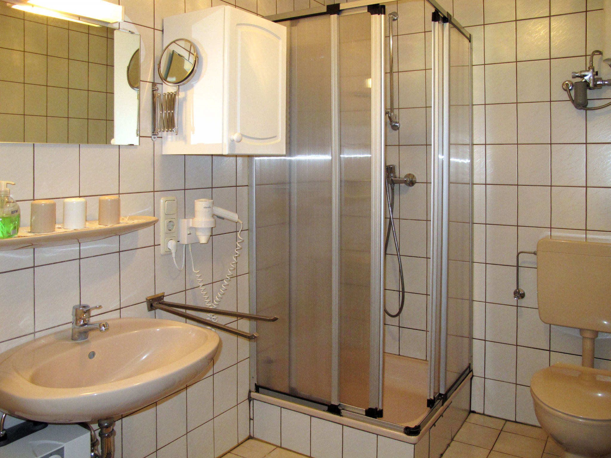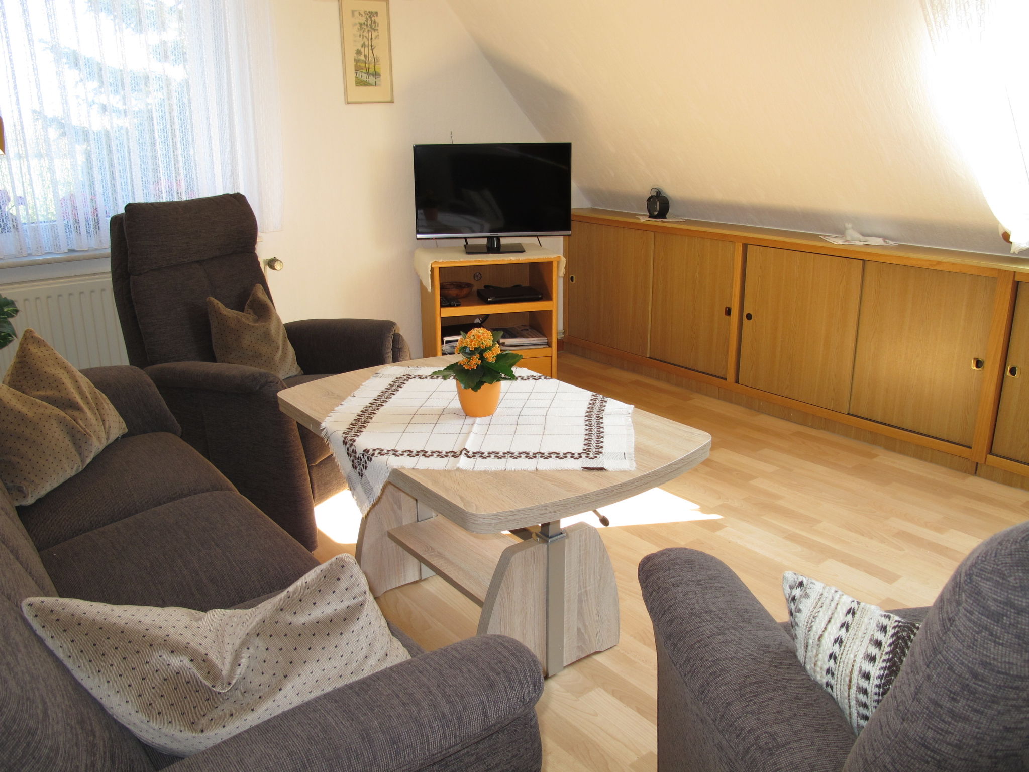 3-room apartment 65 m2 on 1st floor. Cosy furnishings: living room with satellite TV, radio, CD-player and DVD. 1 room with 1 double bed. 1 room with 2 beds. Kitchen (4 hot plates, oven, toaster, kettle, electric coffee machine) with dining table. Shower/WC. Facilities: children's high chair, baby cot. Internet (WiFi, free). Please note: non-smokers only. Smoke alarm.