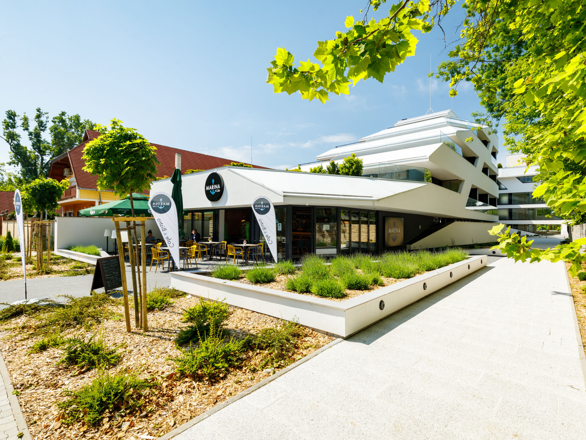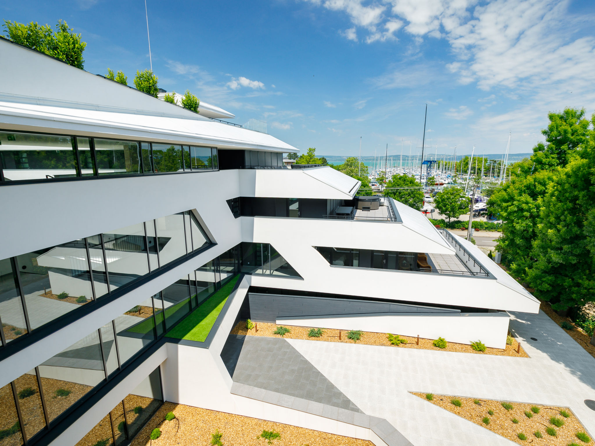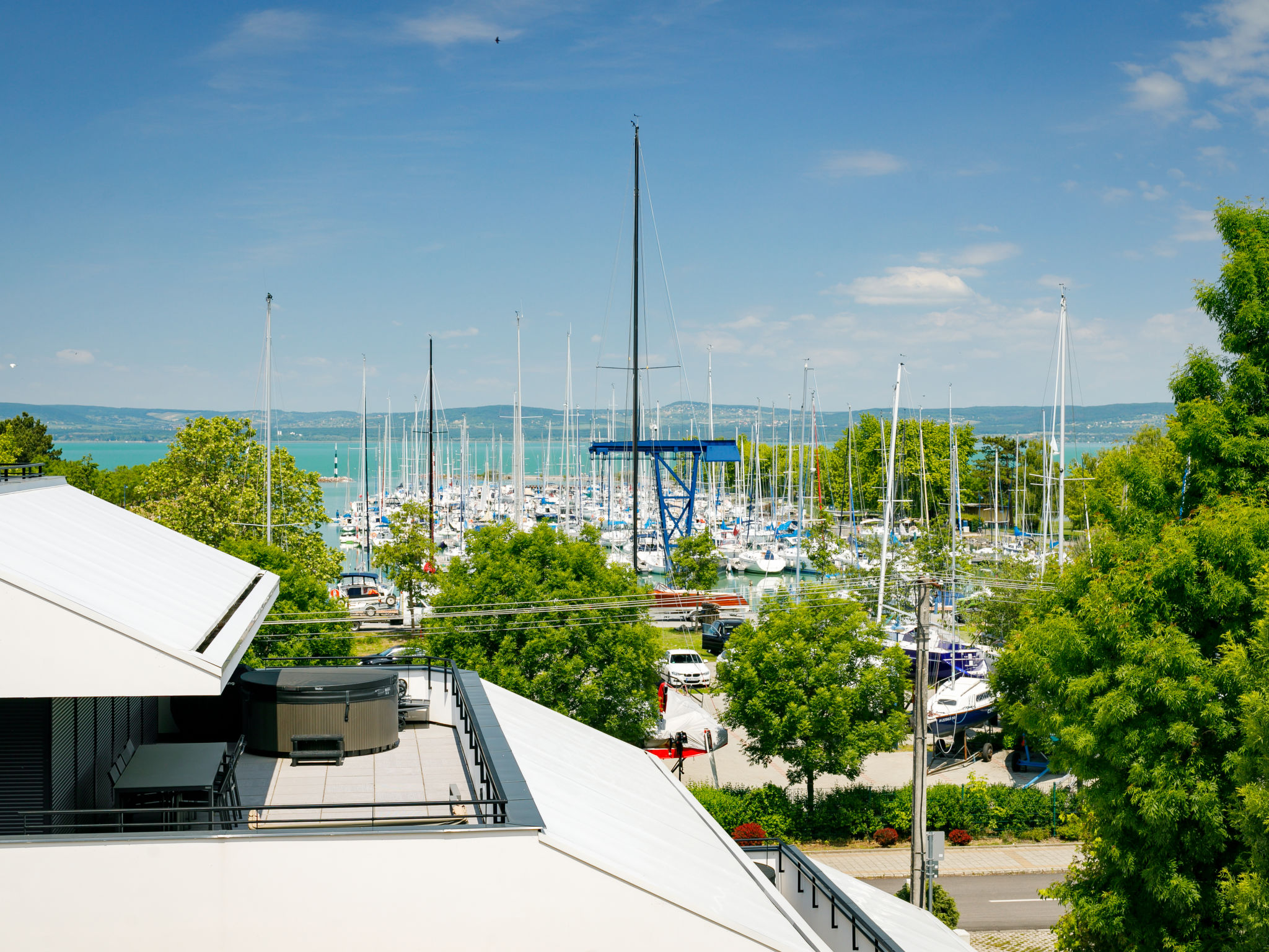 Balatonszemes 7 km from Balatonlelle: Modern, beautiful apartment block, built in 2020. In the resort, in a central position, 100 m from the lake, 350 m from the beach. For shared use: swimming pool angular heated (8 x 20 m, seasonal availability: 15.May. - 15.Sep.). In the house: internet café, WiFi, lift, sun terrace. Breakfast on request (extra). Grocery 200 m, restaurant 100 m, railway station 450 m, grass beach 300 m. Sports harbour 100 m. Nearby attractions: Tihany 14 km.