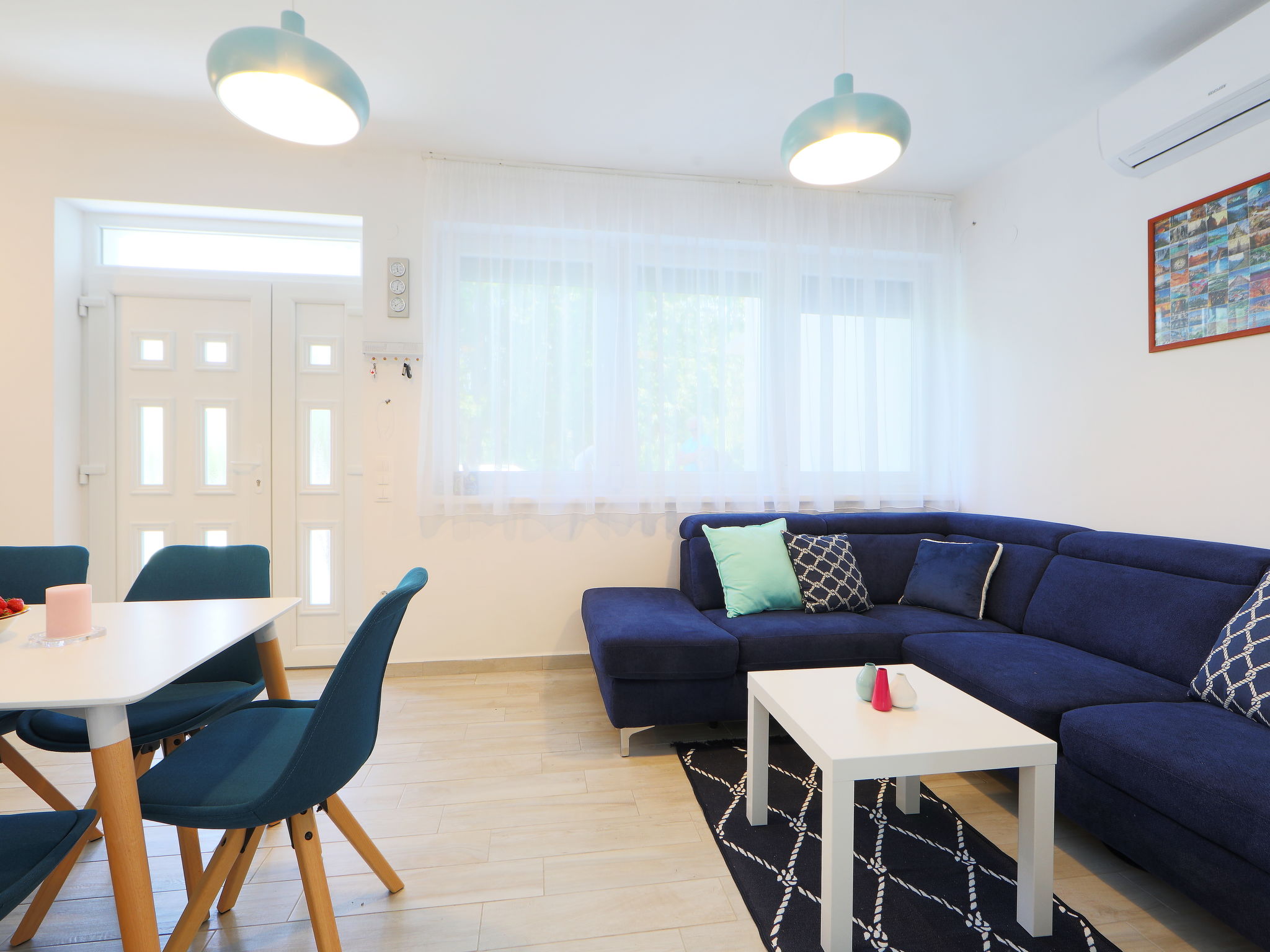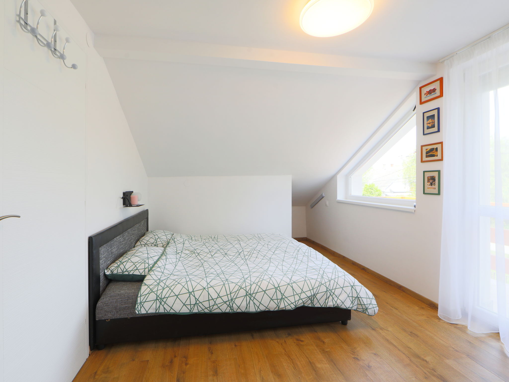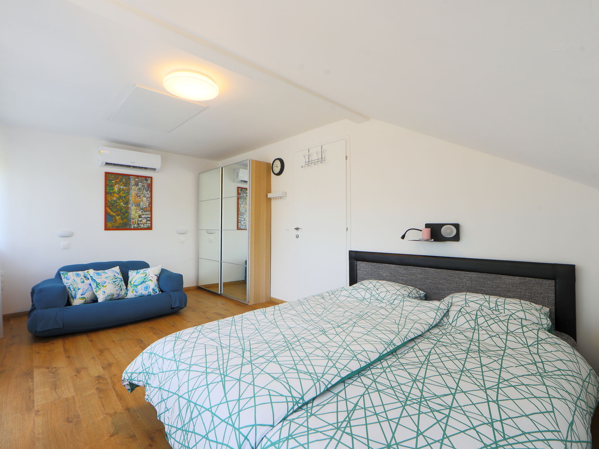 3-room semi-detached house 80 m2. Partly with sloping ceilings, comfortable and modern furnishings: living/dining room with 1 pull-out bed (2 pers.), dining table, cable TV and air conditioning. Exit to the terrace. Kitchen (4 hot plates, dishwasher, microwave, freezer, electric coffee machine). Exit to the garden. Shower/WC. No heating option. Upper floor: 1 room with 1 french bed (180 cm, length 200 cm), air conditioning. Exit to the balcony. 1 small room with 1 x 2 bunk beds, air conditioning. Shower/WC. Balcony 4 m2, large terrace 20 m2, small terrace 8 m2. Terrace furniture, balcony furniture. Facilities: children's high chair, baby cot (extra). Parking (fenced 2 cars). Suitable for families. MA20013695