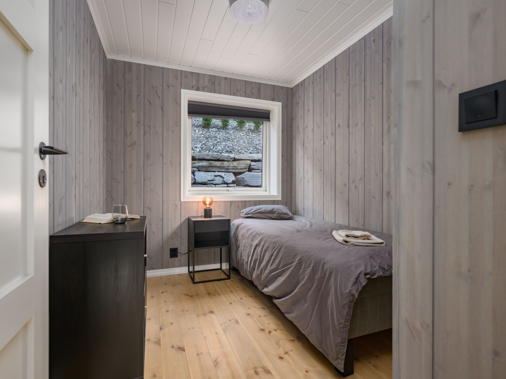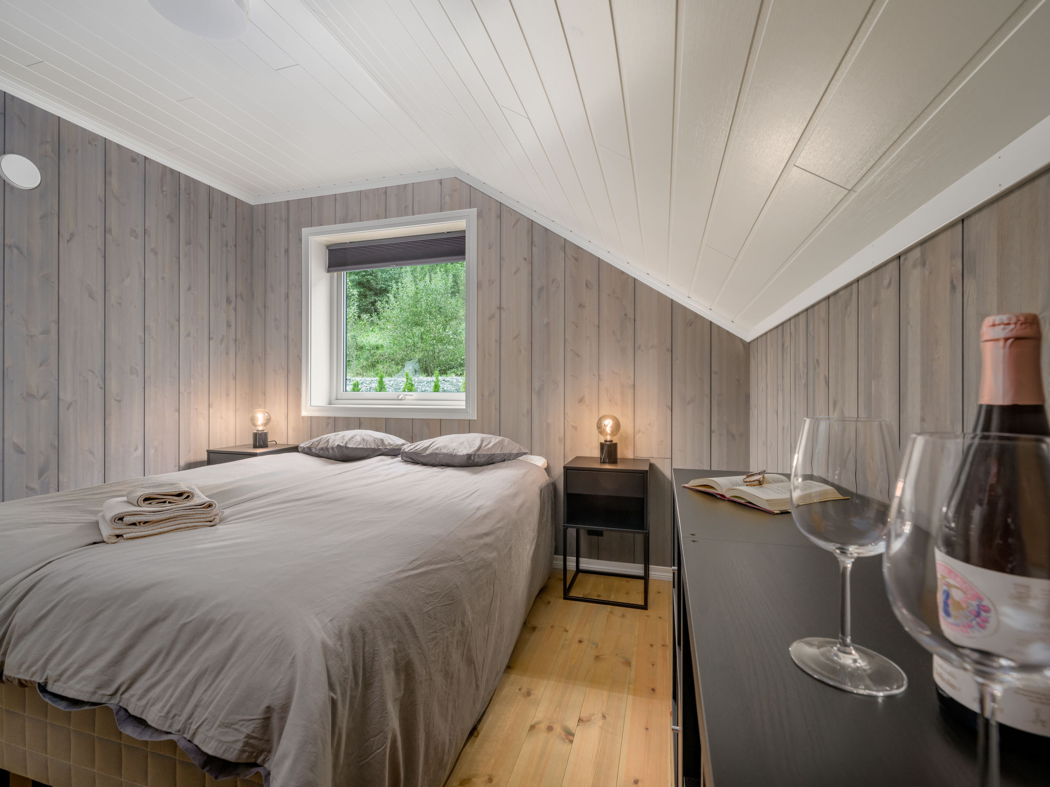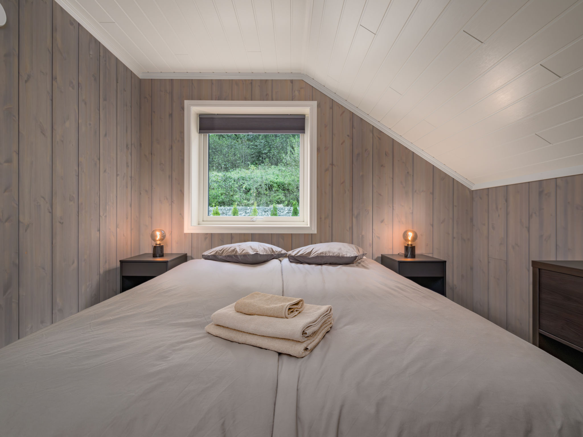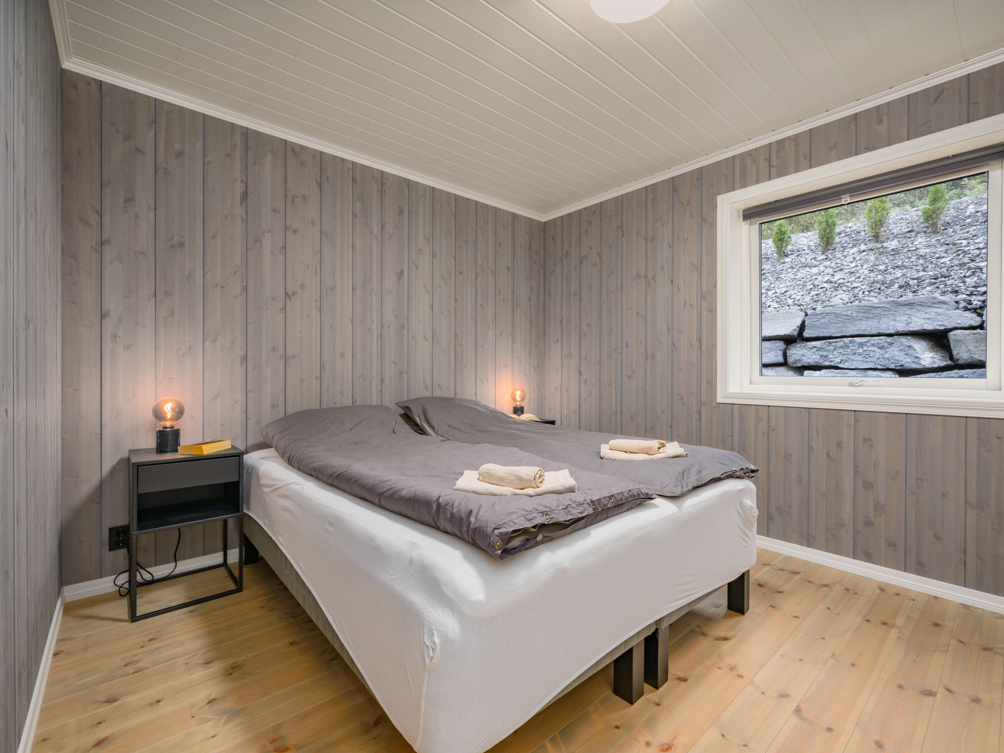 "Mathias", 6-room chalet 115 m2 on 2 levels. Bright, tasteful furnishings: open living/dining room with TV and heating stove. 1 room with 1 double bed (160 cm, length 200 cm). 1 room with 1 bed (90 cm, length 200 cm). Open kitchen (oven, dishwasher, 4 induction hot plates, toaster, kettle, microwave, freezer, electric coffee machine) with dining table. Shower/WC. Upper floor: open living room. 1 room with 1 double bed (160 cm, length 200 cm). 1 room with 2 beds (80 cm, length 200 cm). Beautiful panoramic view of the sea, the mountains and fjord. Facilities: washing machine, sauna. Internet (WiFi, free). Please note: non-smokers only. 924531169